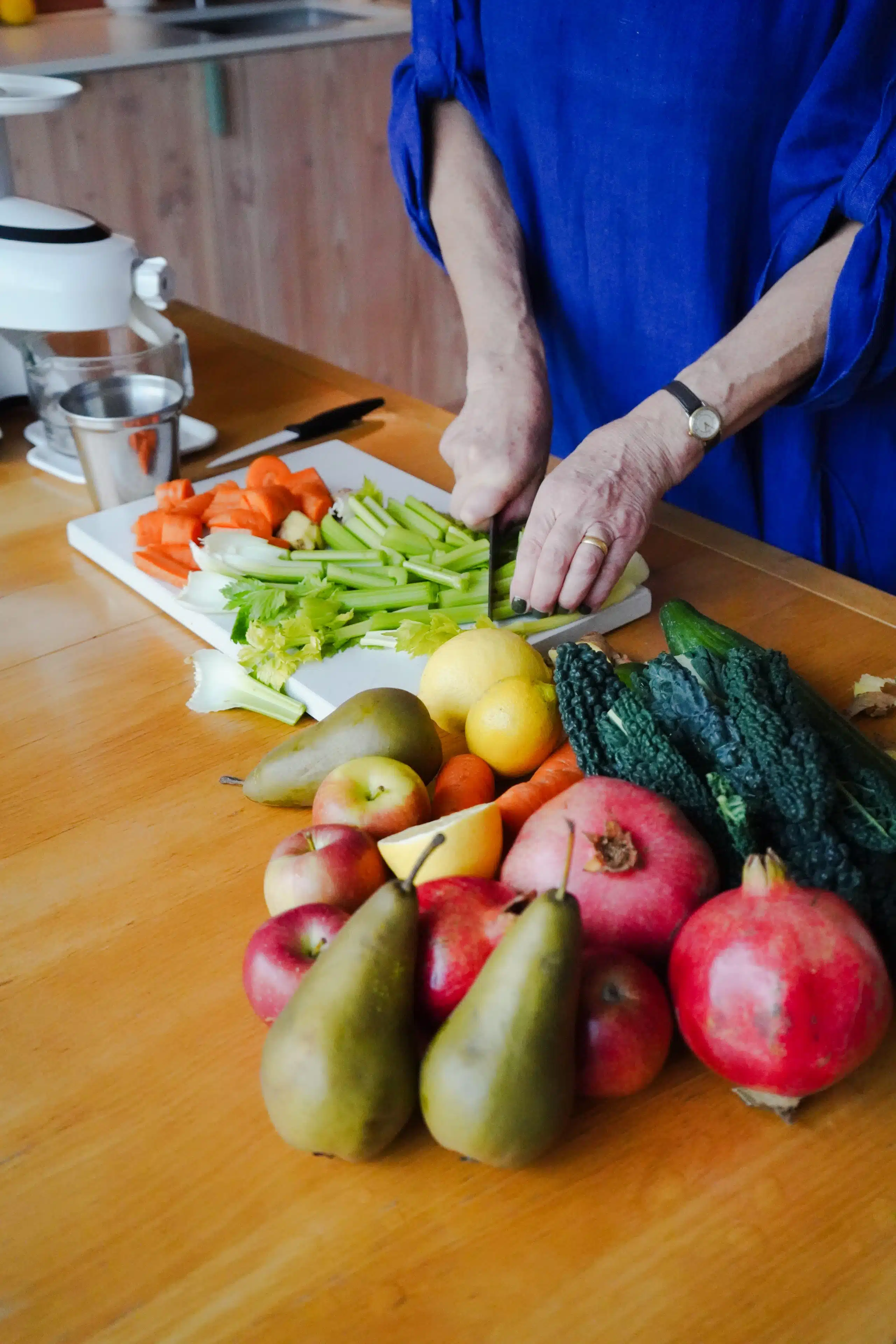 Let’s start with juicers. A juicer is your go-to for making a clean, refreshing drink with a delicious subtle taste. It extracts the juice full of nutrients, vitamins and minerals and leaves behind the pulp. It does the work for your body, giving your body a little ‘holiday’ and preserving your energy. You would not eat a whole plate of vegetables see photo below but downing the juice gives you all the nutrients you need in one or two glasses. It’s also a wonderful way for your family and children to get their ‘five a day’ in a fun and colourful way.